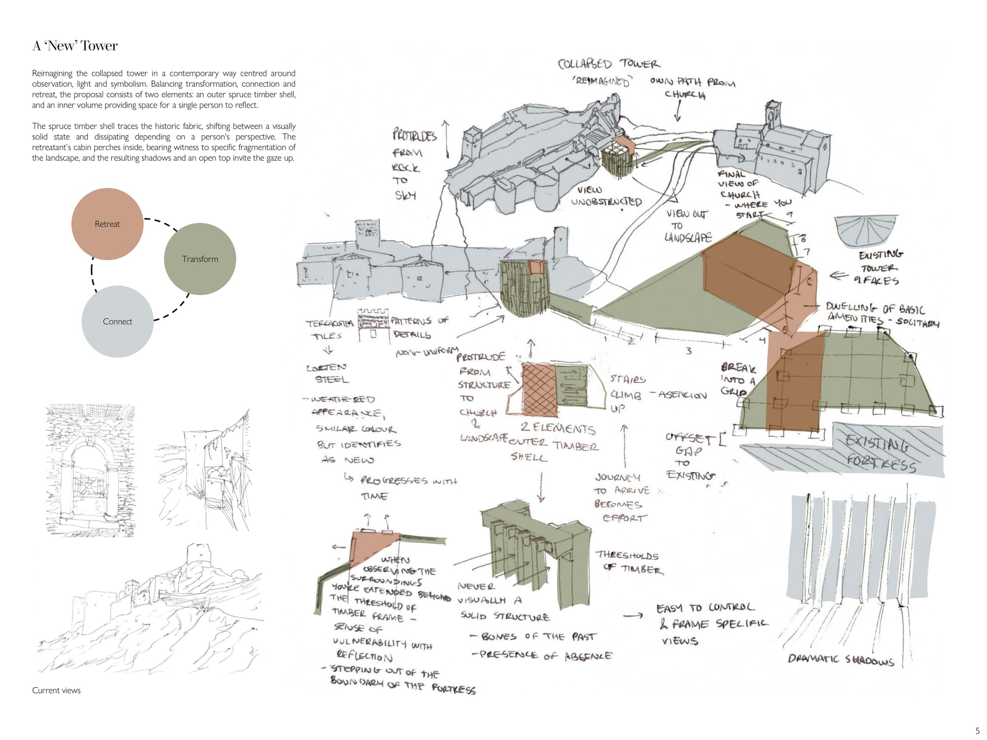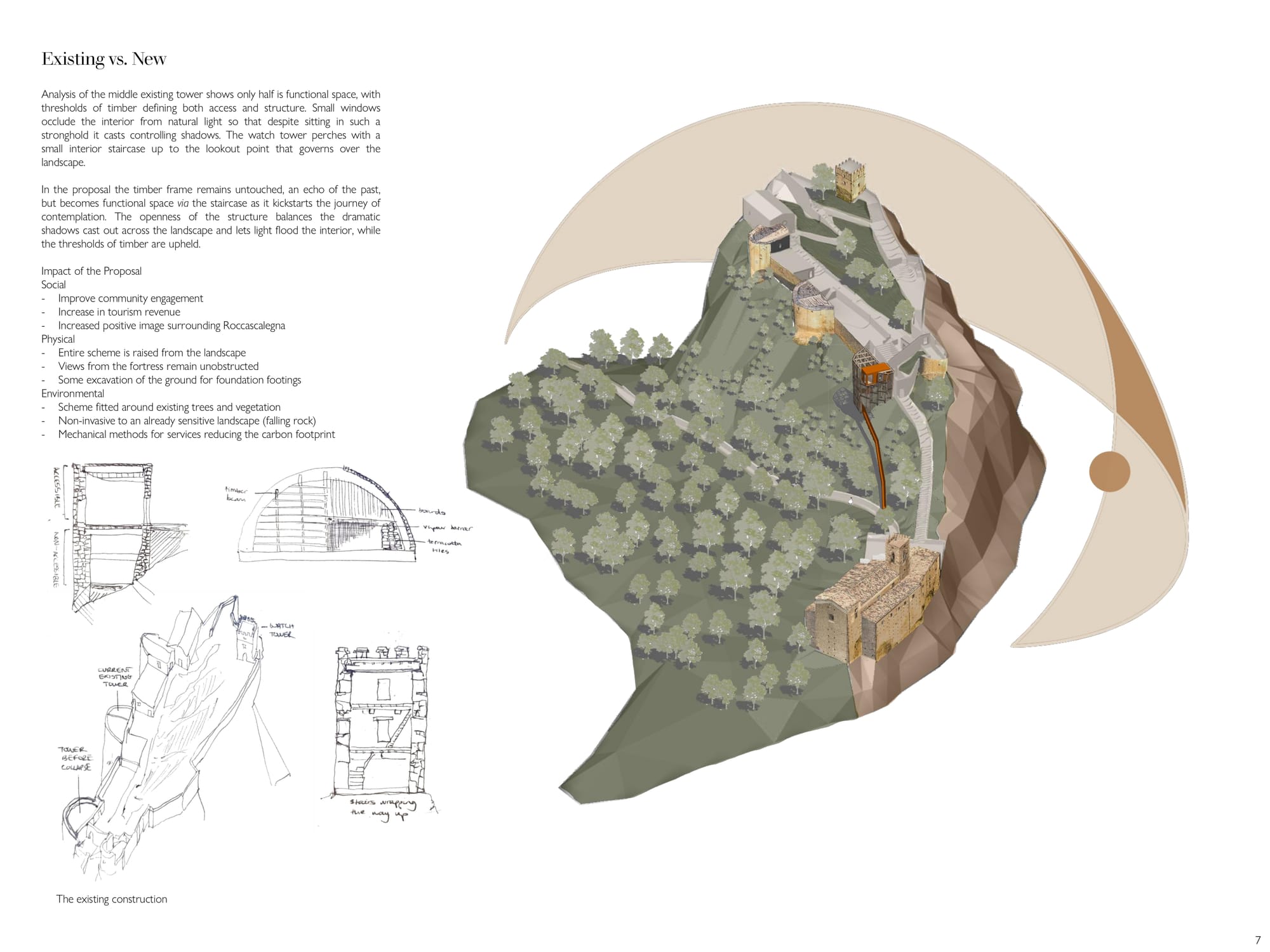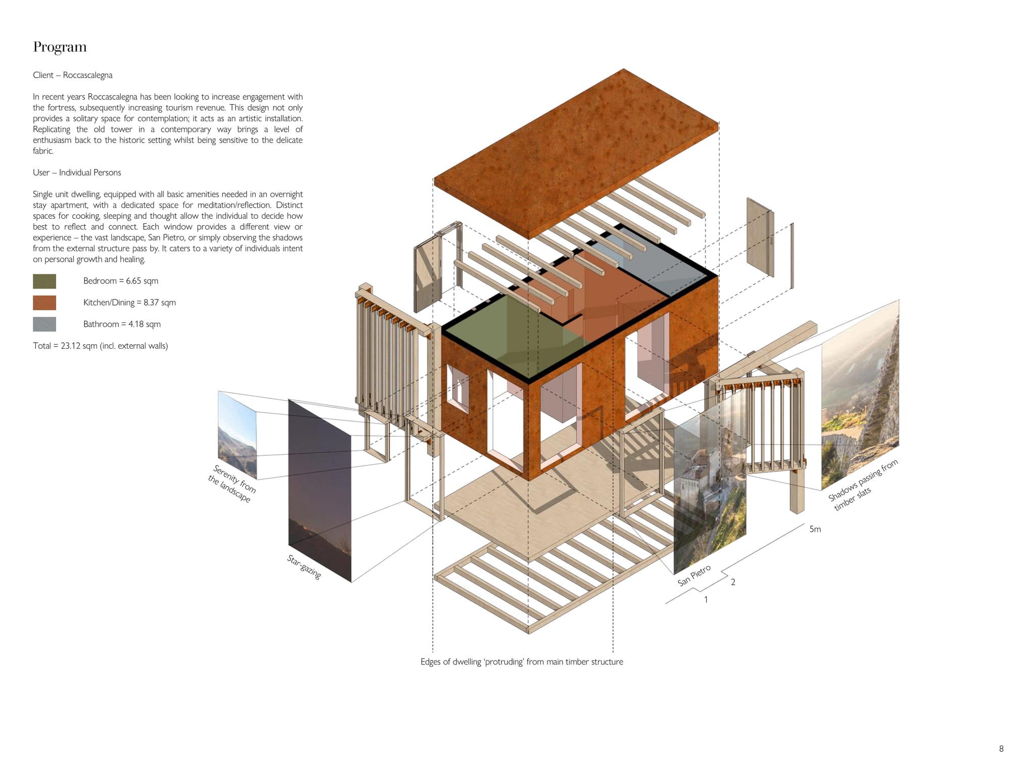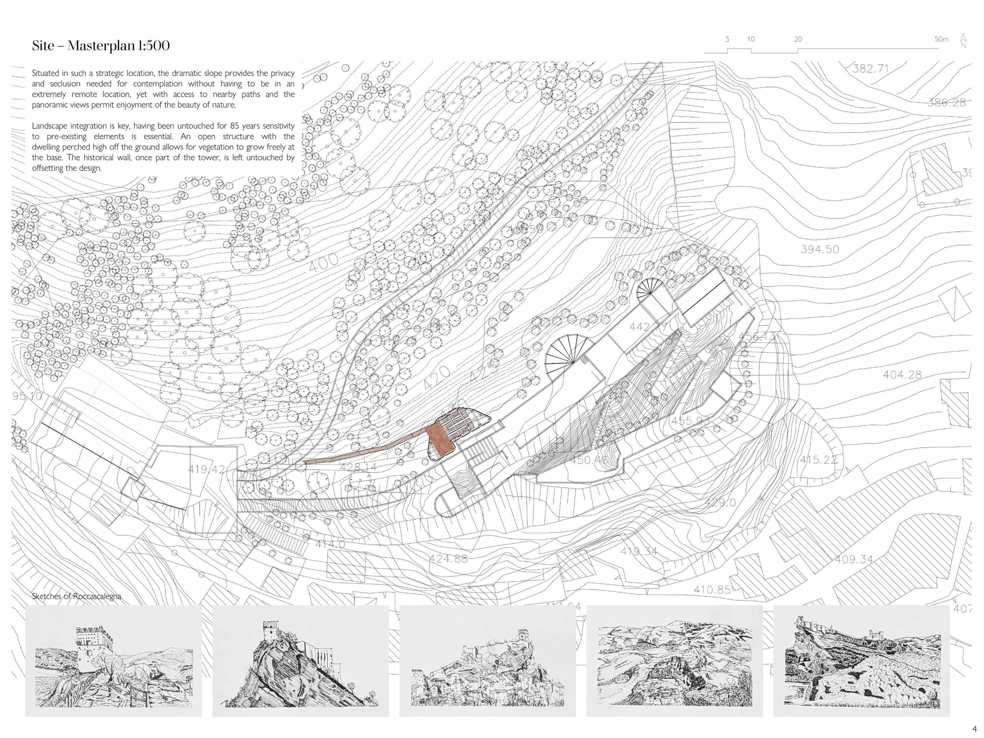 Starting and completing this project over the span of two weeks, the brief was to design a solitary observatory dwelling (approx. 20–25 sqm) located in visual dialogue with the fortress of Roccascalegna. The unit should offer a temporary overnight stay experience centered around silence, observation, and contemplation, integrating architectural sensitivity with the mystical character of the site. The project must reflect a careful balance between heritage respect, landscape integration, and experiential quality. Particular attention should be given to light, materiality, and symbolism, ensuring the dwelling becomes a quiet yet meaningful addition to the cultural and environ mental narrative of the fortress.